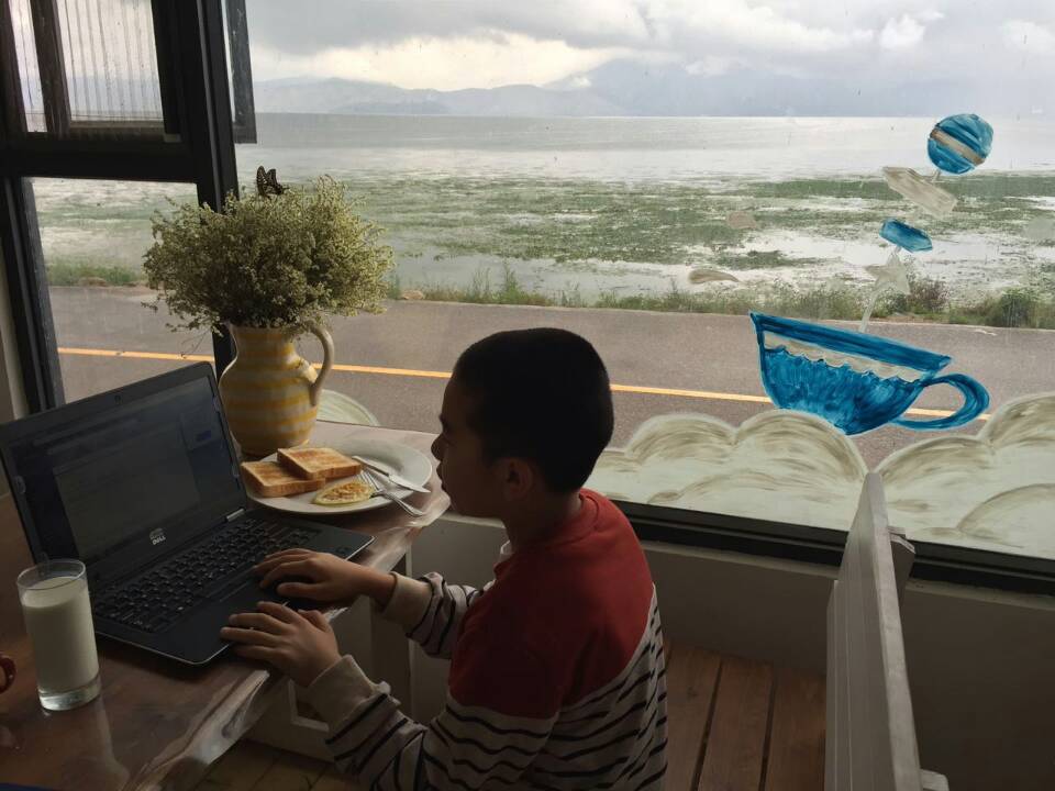 一位家长告诉我们,孩子在度假时边吃早餐边听课,可认真了!